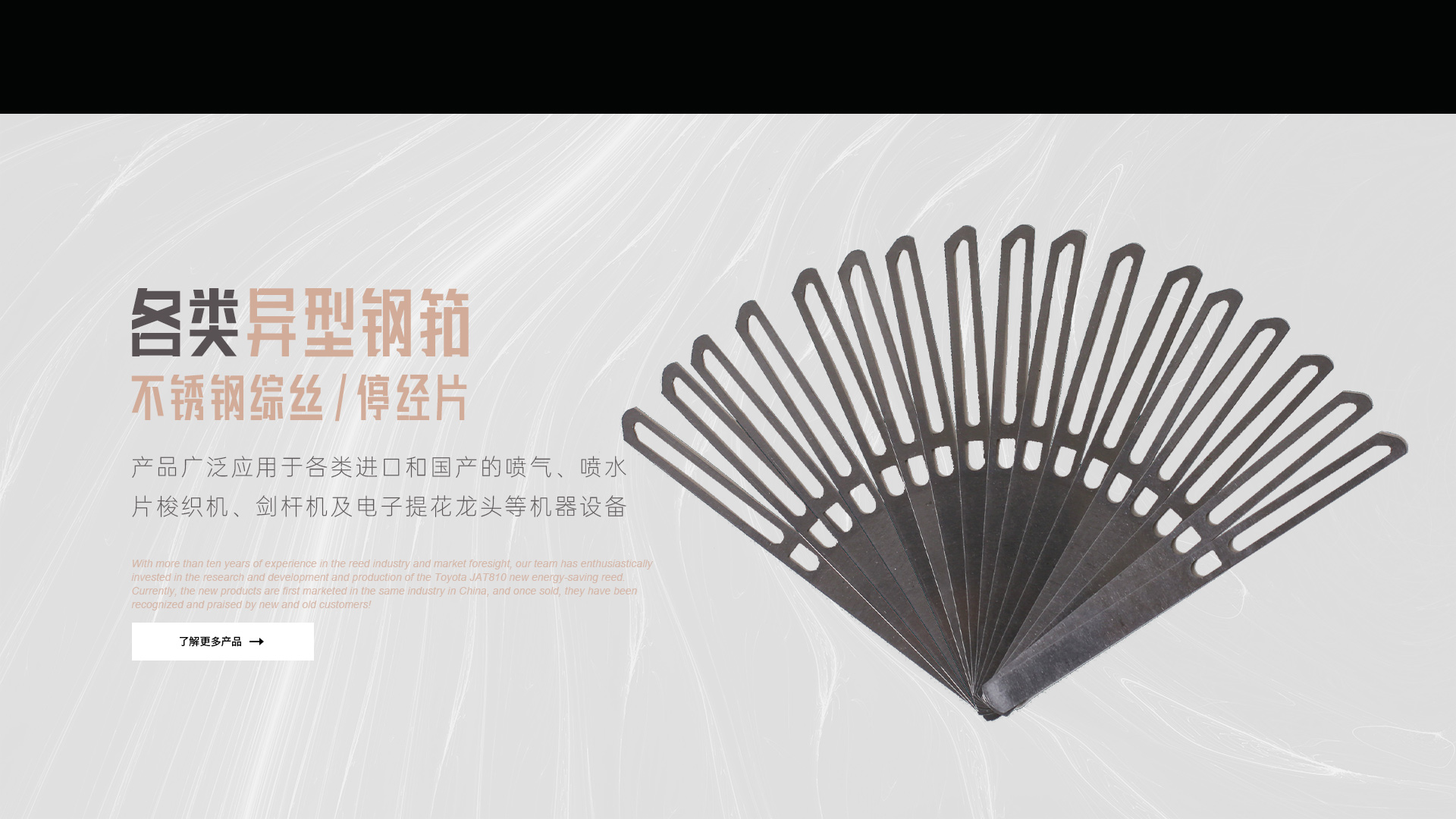 從事研發(fā)生產及銷售各類新型紡織器材的生產型企業。公司主要產品有:噴氣織機用各類異型鋼筘(傳統型豐田JAT710鋼筘及新研發(fā)的豐田JAT810節(jié)能筘);不銹鋼綜絲及不銹鋼停經片。我們的產品廣泛應用于各類進口和國產的噴氣、噴水、片梭織機、劍桿機及電子提花龍頭等機器設備。